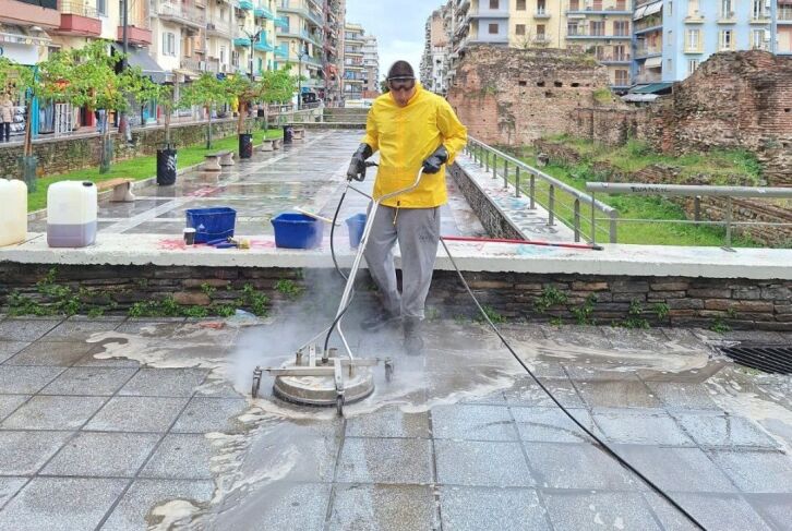 Ο Στέλιος Αγγελούδης επιθεωρεί τις εργασίες στη Ροτόντα και Δημητρίου Γούναρη, στο πλαίσιο δράσεων για καθαρότερη πόλη και βελτίωση της αισθητικής εικόνας.