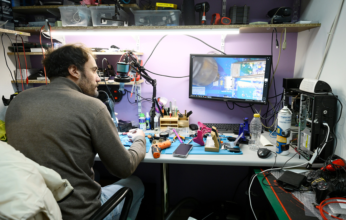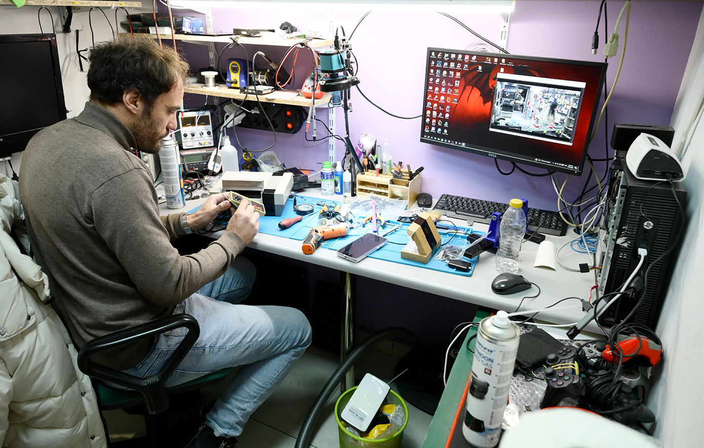 Τον επισκεφθήκαμε στο εργαστήριό του, εκεί όπου έχει αναλάβει να φέρει σε πέρας τις πιο δύσκολες επισκευές. Με ένα μικροσκόπιο που συνδέεται στον υπολογιστή βλέπει τις πιο απομονωμένες λεπτομέρειες και με χειρουργικές κινήσεις δίνει δεύτερη ζωή στις παιχνιδομηχανές που δεν πάψαμε ποτέ να τις αγαπάμε και να τις αναπολούμε.