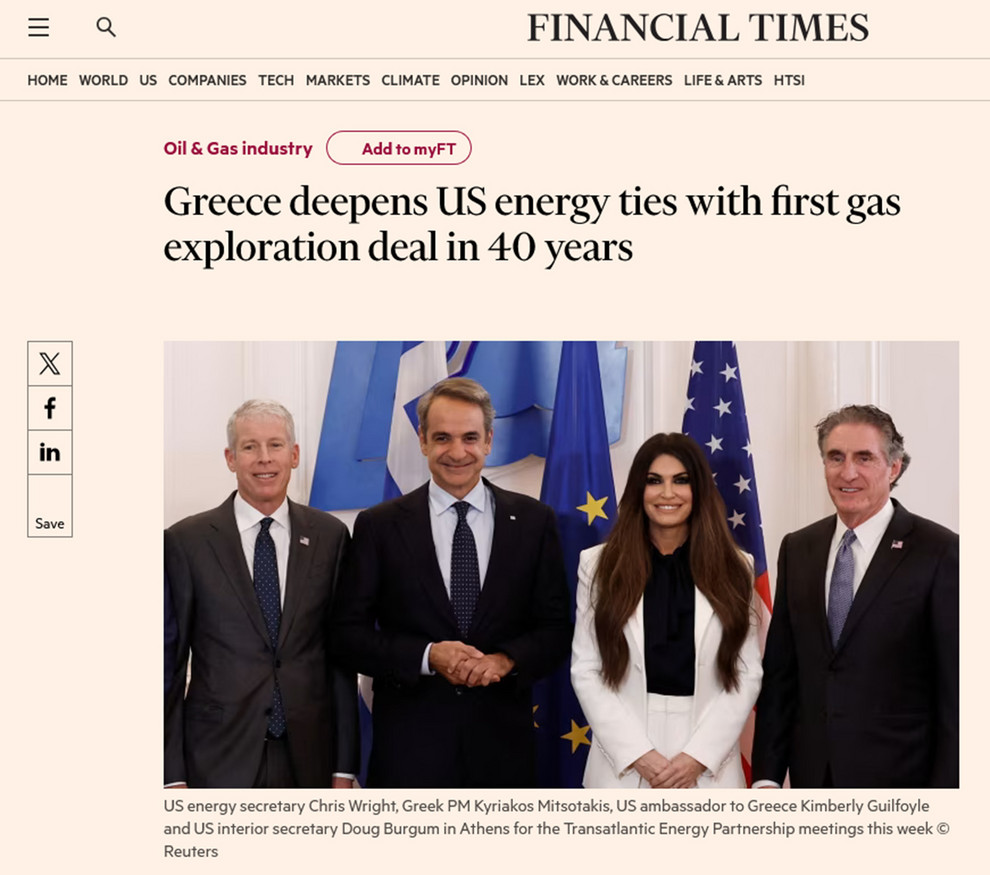 Η Ελλάδα υπέγραψε την πρώτη της συμφωνία για υπεράκτια εξόρυξη φυσικού αερίου έπειτα από τέσσερις δεκαετίες, σε μια ιστορική συμφωνία που ηγείται η ExxonMobil και σηματοδοτεί το αυξανόμενο ενδιαφέρον της Ουάσιγκτον για την περιοχή της ανατολικής Μεσογείου, όπως αναφέρουν σε άρθρο τους οι Financial Times.