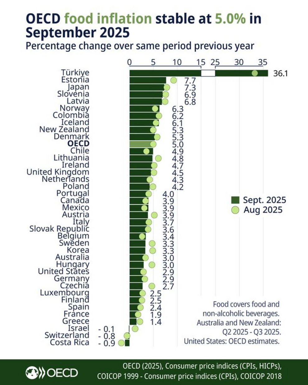 Σύμφωνα με τα τελευταία στοιχεία του ΟΟΣΑ για τον Σεπτέμβριο 2025, ο πληθωρισμός στα τρόφιμα στη χώρα μας διαμορφώθηκε στο 1,4%, έναντι 3,5% στον μέσο όρο της Ε.Ε. και 5% στις χώρες του ΟΟΣΑ. Αυτό τοποθετεί την Ελλάδα στη χαμηλότερη θέση στην Ε.Ε. και στην τέταρτη χαμηλότερη θέση ανάμεσα στις 38 χώρες-μέλη του ΟΟΣΑ.