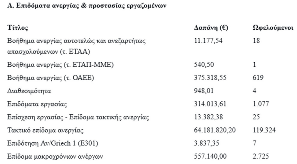 - Δημοσιεύθηκαν αναλυτικά στοιχεία για τις δαπάνες και τον αριθμό των ωφελουμένων, οργανωμένα σε τέσσερις κατηγορίες.