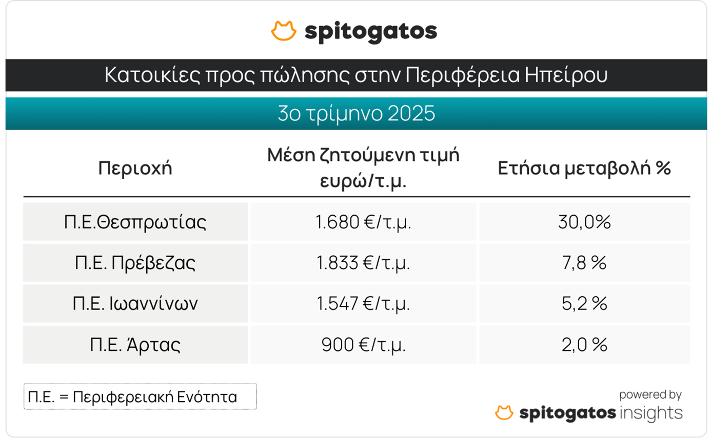 Από το 2019 έως το 2025, οι τιμές πώλησης κατοικιών αυξήθηκαν κατά 41% και οι τιμές ενοικίασης κατά 47,2%. Οι Πρέβεζα και Θεσπρωτία έχουν τις υψηλότερες τιμές πώλησης, ενώ τα Ιωάννινα κυριαρχούν στις ενοικιάσεις.