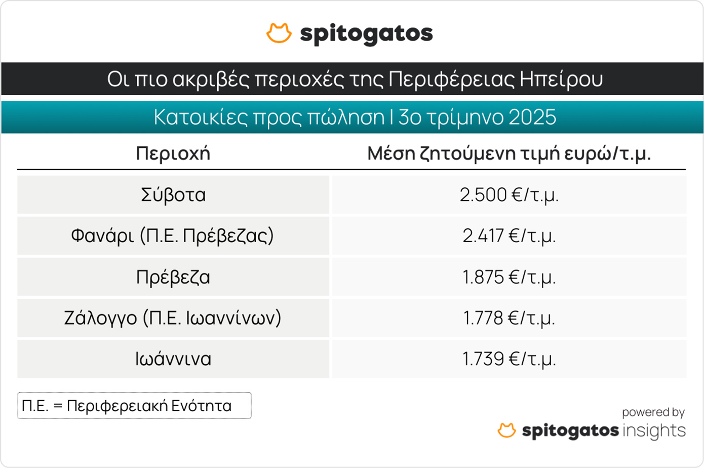 Η ζήτηση αυξήθηκε σημαντικά το 2025, με ενδιαφέρον από αγοραστές σε Ελλάδα και εξωτερικό, κυρίως για μονοκατοικίες και διαμερίσματα. Οι πιο ακριβές περιοχές για αγορά παραμένουν τα Σύβοτα, ενώ οικονομικότερες επιλογές υπάρχουν σε Άρτα και Μέτσοβο.