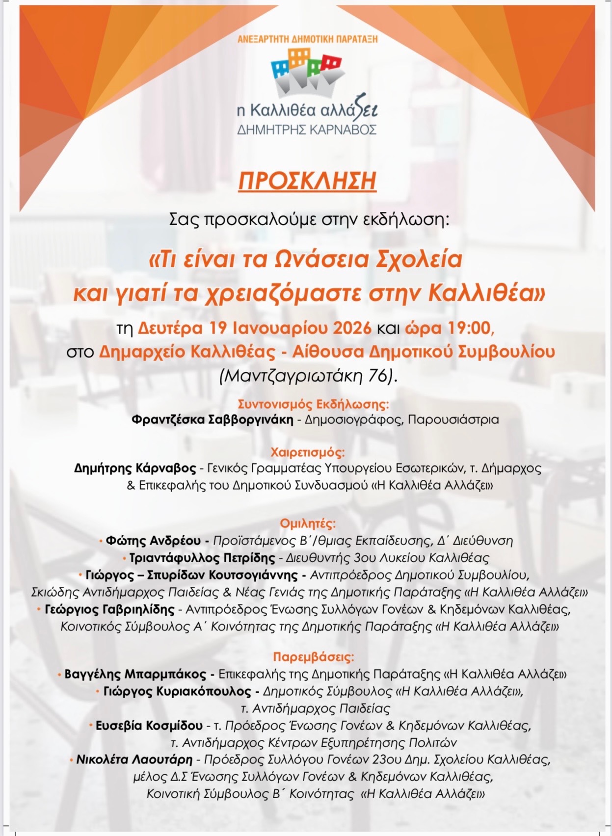 Μια ενδιαφέρουσα εκδήλωση διοργανώνει σήμερα Δευτέρα 19 Ιανουαρίου στον Δήμο Καλλιθέας, η Ανεξάρτητη Δημοτική Παράταξη “Η Καλλιθέα αλλάζει” του πρώην δημάρχου Δημήτρη Κάρναβου και αφορά τον θεσμό των Ωνάσειων Σχολείων και γιατί είναι αναγκαία για την τοπική κοινωνία της Καλλιθέας.