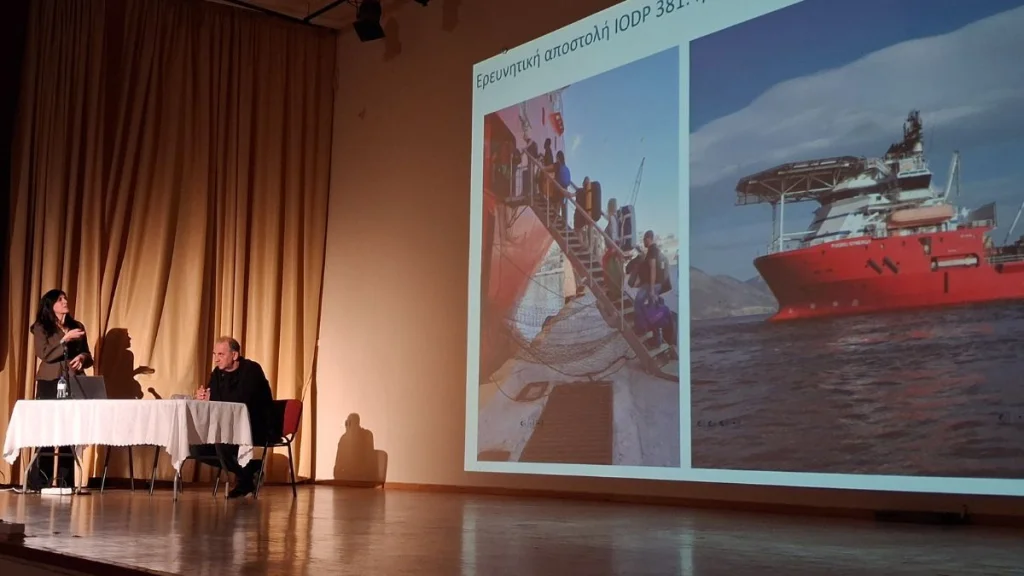 Κεντρική ομιλήτρια της εκδήλωσης ήταν η Δρ. Κατερίνα Κούλη, Καθηγήτρια Παλαιοντολογίας – Παλαιοβοτανικής και Γεωαρχαιολογίας του Τμήματος Γεωλογίας και Γεωπεριβάλλοντος του Εθνικού και Καποδιστριακού Πανεπιστημίου Αθηνών. Η Δρ. Κατερίνα Κούλη παρουσίασε με επιστημονική πληρότητα και σαφήνεια τα ευρήματα της έρευνας που πραγματοποιήθηκε το 2017 στον Κορινθιακό κόλπο, στο πλαίσιο του Διεθνούς Προγράμματος για την Εξερεύνηση των Ωκεανών (IODP, Exp. 381 «Corinth Active Rift Development»). Μέσα από την ιδιαίτερα ενδιαφέρουσα ομιλία της και την ανάλυση των δεδομένων της ερευνητικής αποστολής, έδωσε στο κοινό την ευκαιρία να γνωρίσει τη γεωπεριβαλλοντική ιστορία και εξέλιξη της περιοχής κατά τα τελευταία περίπου 1.000.000 χρόνια, αναδεικνύοντας τον Κορινθιακό κόλπο ως μία εξέχουσα «χρονοκάψουλα» βιοποικιλότητας και ιστορίας.