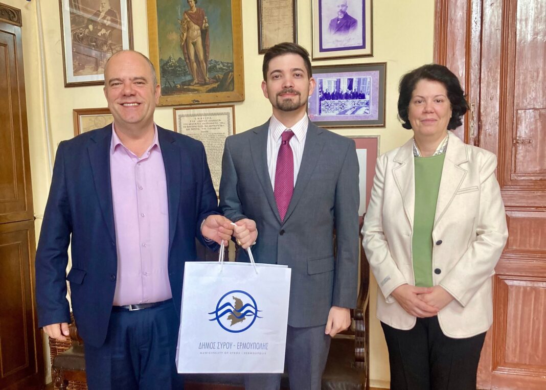 Μετά το πέρας της συνάντησης, ο κ. Κωνσταντίνος-Παύλος Δαμαλάς ξεναγήθηκε στους χώρους του Δημαρχιακού Μεγάρου και εξέφρασε την επιθυμία του να επιστρέψει σύντομα στην Ερμούπολη.