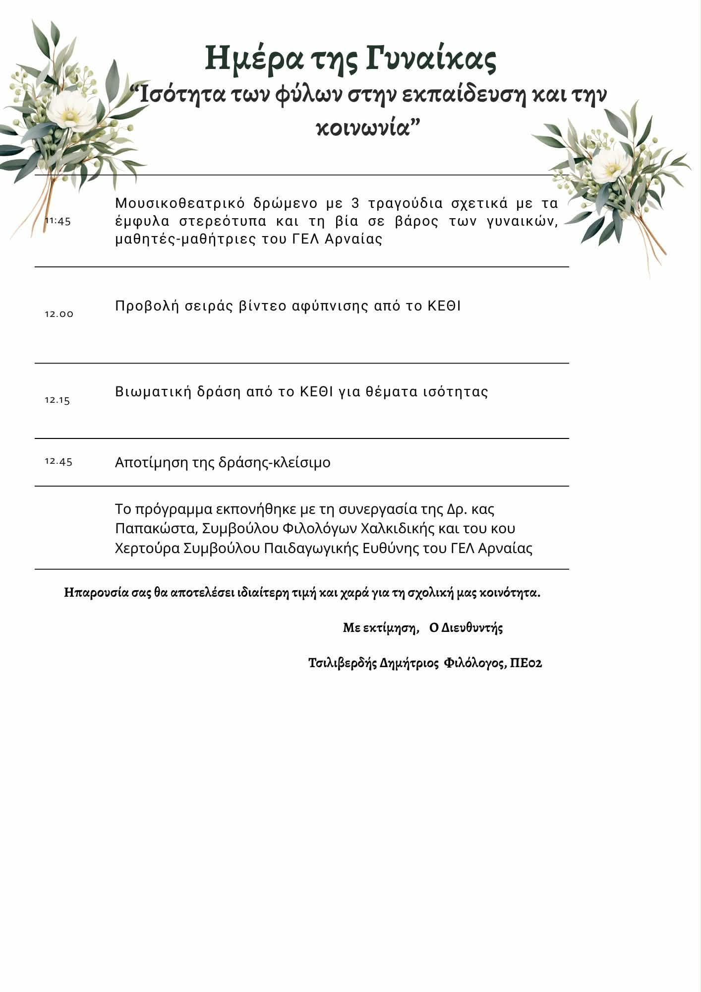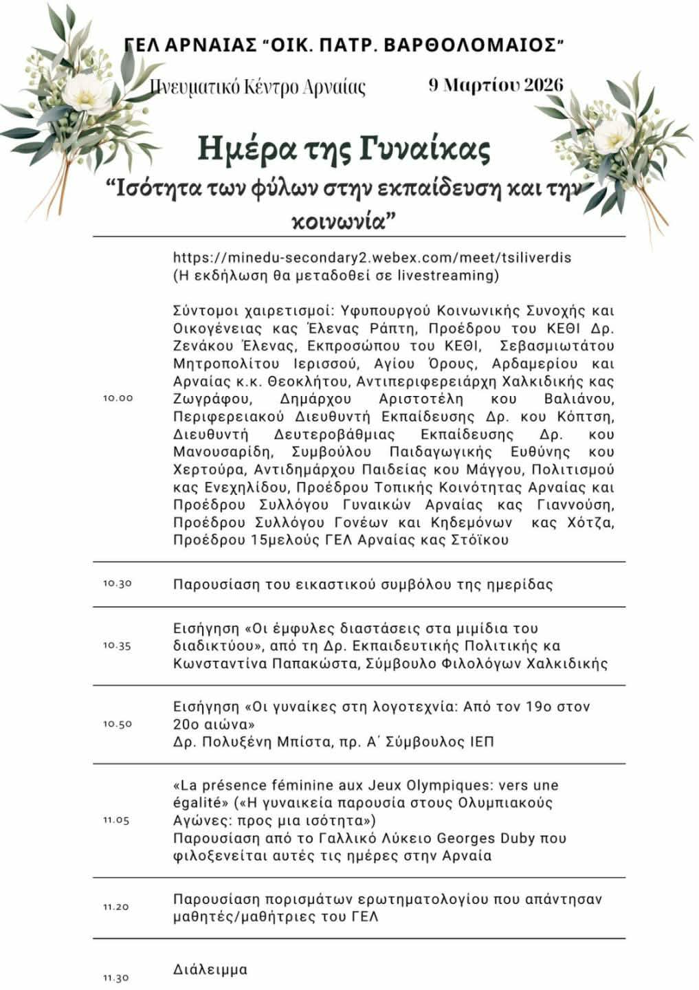 Άλλη μία σημαντική εκδήλωση διοργανώνει το ΓΕΛ ΑΡΝΑΙΑΣ ¨ΟΙΚ. ΠΑΤΡΙΑΡΧΗΣ ΒΑΡΘΟΛΟΜΑΙΟΣ”, αυτή τη φορά με την ευκαιρία της ημέρας της γυναίκας.