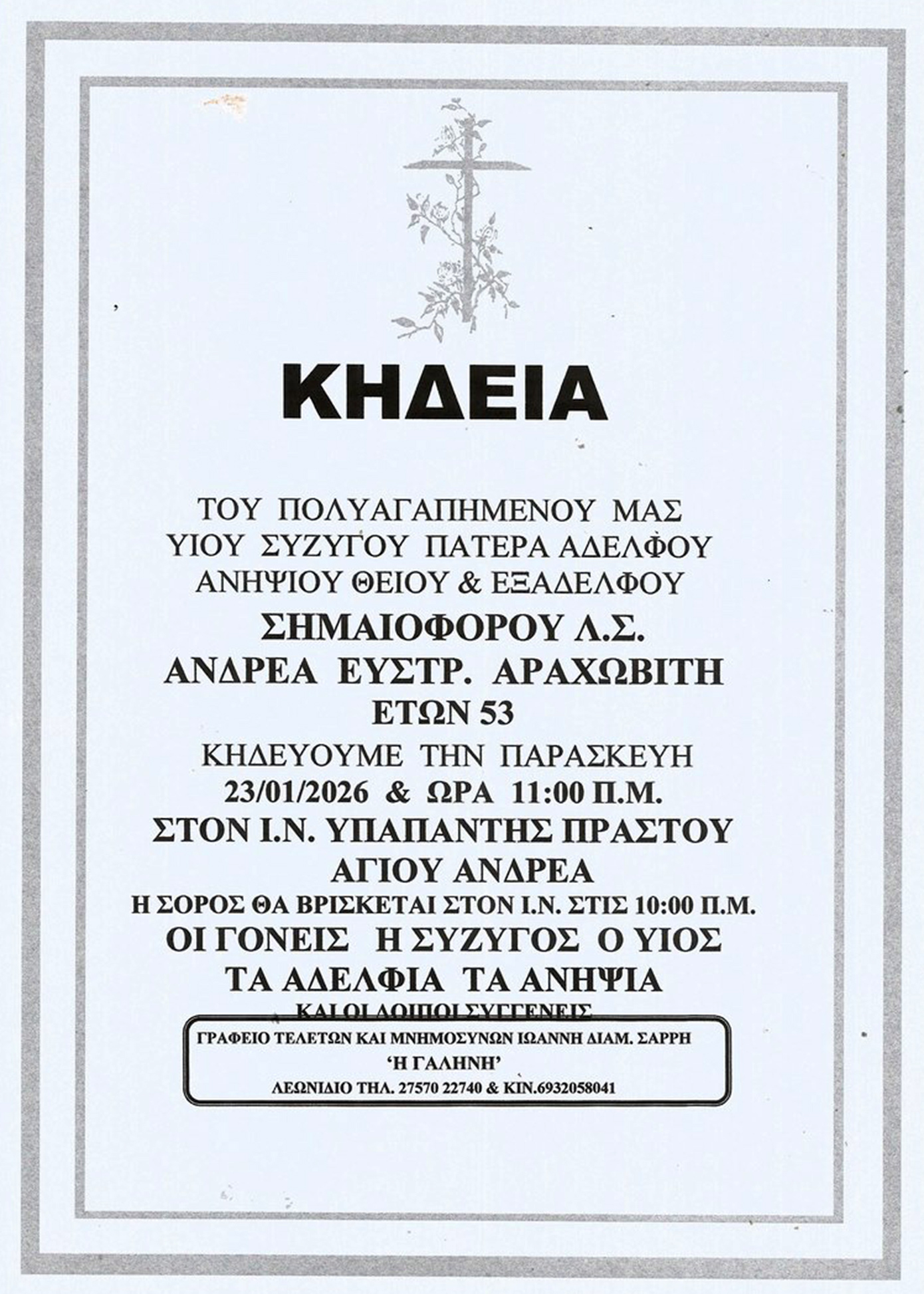 Η κηδεία του θα τελεστεί την Παρασκευή, 23 Ιανουαρίου, στις 11:00 από τον Ιερό Ναό Υπαπαντής Πραστού Αγίου Ανδρέα. Η σορός του θα βρίσκεται από τις 10:00 στον ναό.