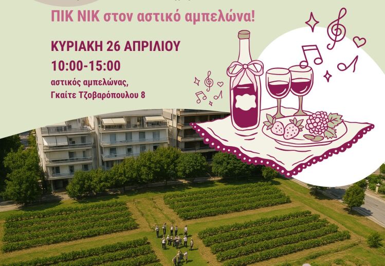 Ο Δήμος Θεσσαλονίκης, η Αντιδημαρχία Περιβάλλοντος, Αστικού Πρασίνου και Πανίδας, σε συνεργασία με την 4η Δημοτική Κοινότητα Θεσσαλονίκης και το Διεθνές Δίκτυο Αστικών Αμπελώνων (Urban Vineyards Association (UVA)), σας προσκαλούν την Κυριακή 26 Απριλίου, από τις 10:00 π.μ. έως τις 15:00 μ.μ., σε ένα ξεχωριστό πικ νικ στον Αστικό Αμπελώνα Δήμου Θεσσαλονίκης (έναντι Γκαίτε, Τζοβαροπούλου 8)