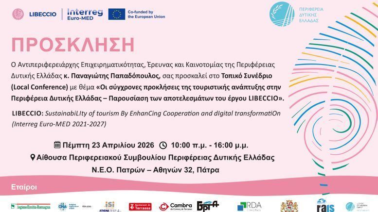 Η Περιφέρεια Δυτικής Ελλάδας διοργανώνει συνέδριο (localconference) με αντικείμενο τις σύγχρονες προκλήσεις της τουριστικής ανάπτυξης, που προκύπτουν μέσα από την παρουσίαση των αποτελεσμάτων του έργου “LIBECCIO”.