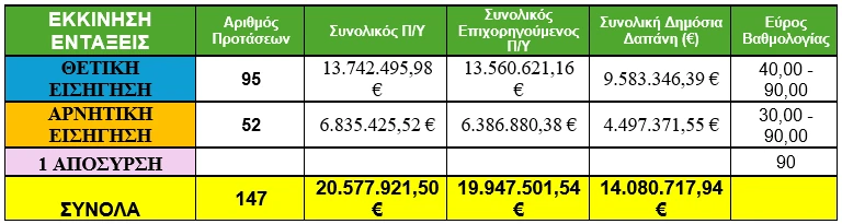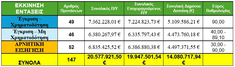 - 46 προτάσεις εγκρίθηκαν χωρίς χρηματοδότηση λόγω εξάντλησης διαθέσιμων πόρων, και