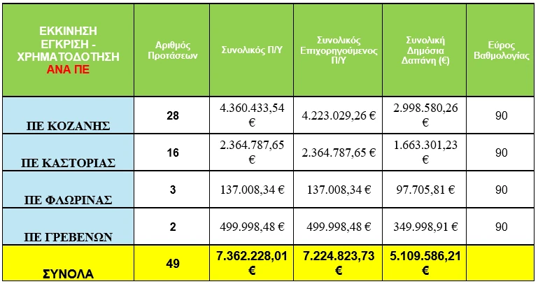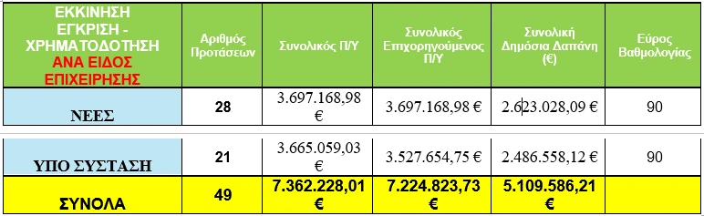 - 49 προτάσεις εγκρίθηκαν για χρηματοδότηση, με συνολικό επιχορηγούμενο Π/Υ 7,22 εκ. € και δημόσια δαπάνη 5,11 εκ. €,
