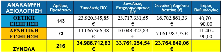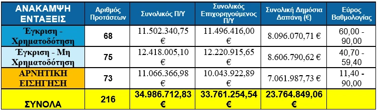 - 68 προτάσεις εγκρίθηκαν για χρηματοδότηση, με συνολικό επιχορηγούμενο Π/Υ 11,50 εκ. € και δημόσια δαπάνη 8,10 εκ. €.