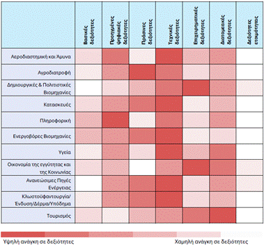 Για τους υπόλοιπους τομείς -Πρωταθλητές της Περιφέρειας, η εικόνα είναι πιο συγκεκριμένη: η Αγροδιατροφή δείχνει επιτακτική ανάγκη για πράσινες και τεχνικές δεξιότητες, ενώ η Πληροφορική σε προηγμένες ψηφιακές δεξιότητες. Στις Πολιτιστικές και Δημιουργικές Βιομηχανίες προτάσσονται οι επιχειρηματικές ικανότητες, αναδεικνύοντας την ανάγκη δυναμικής ένταξης του κλάδου στην αγορά. Τέλος, στον Τουρισμό, η υψηλή ζήτηση για διατομεακές (ή οριζόντιες) δεξιότητες υπογραμμίζει τη στενή διασύνδεσή του με άλλους τομείς της οικονομίας όπως η Αγροδιατροφή, οι Μεταφορές, η Πληροφορική, ο Πολιτισμός κ.ά.