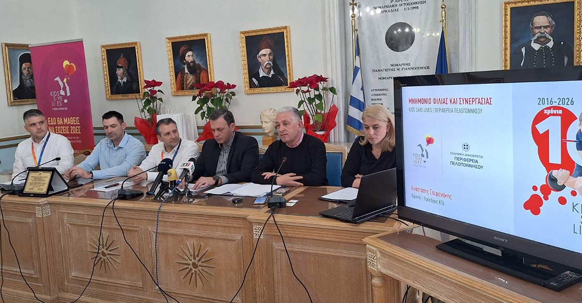 Χθες, Πέμπτη 5 Μαρτίου, στην έδρα της Περιφέρειας Πελοποννήσου στην Τρίπολη, υπεγράφη, με πρωτοβουλία του Περιφερειάρχη Πελοποννήσου Δημήτρη Πτωχού, το Μνημόνιο Συνεργασίας μεταξύ της Περιφέρειας Πελοποννήσου και της Ελληνικής Ανθρωπιστικής Οργάνωσης “Kids Save Lives – Τα Παιδιά Σώζουν Ζωές”, με στόχο την ενίσχυση της πρόληψης και της δημόσιας υγείας στην περιοχή.