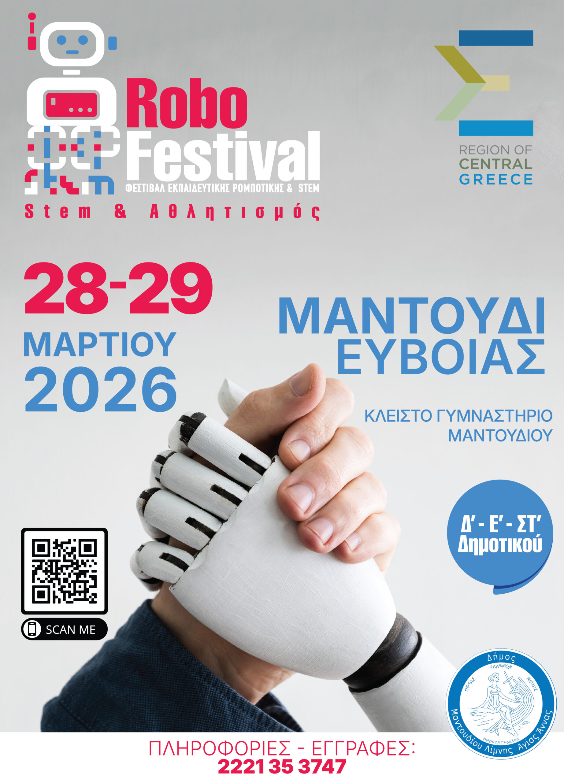 Η Περιφέρεια Στερεάς Ελλάδας διοργανώνει Φεστιβάλ Εκπαιδευτικής Ρομποτικής “RoboFestival STEM | Robotics – Coding – Engineering – Maths”, έχοντας ως βασικό θέμα την κατασκευή και τον προγραμματισμό ρομπότ με χρήση δομικών στοιχείων LEGO, που θα πραγματοποιηθεί στις 28 και 29 Μαρτίου 2026, στο Μαντούδι και συγκεκριμένα στο κλειστό Γυμναστήριο Μαντουδίου.