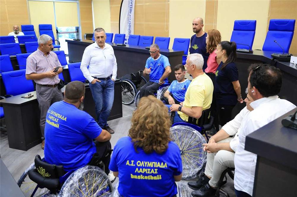 Η Περιφέρεια Θεσσαλίας παρέδωσε πέντε σύγχρονα αναπηρικά αμαξίδια στην ομάδα μπάσκετ ΑμεΑ της Ολυμπιάδας Λάρισας, σε μια εκδήλωση που πραγματοποιήθηκε την Πέμπτη.