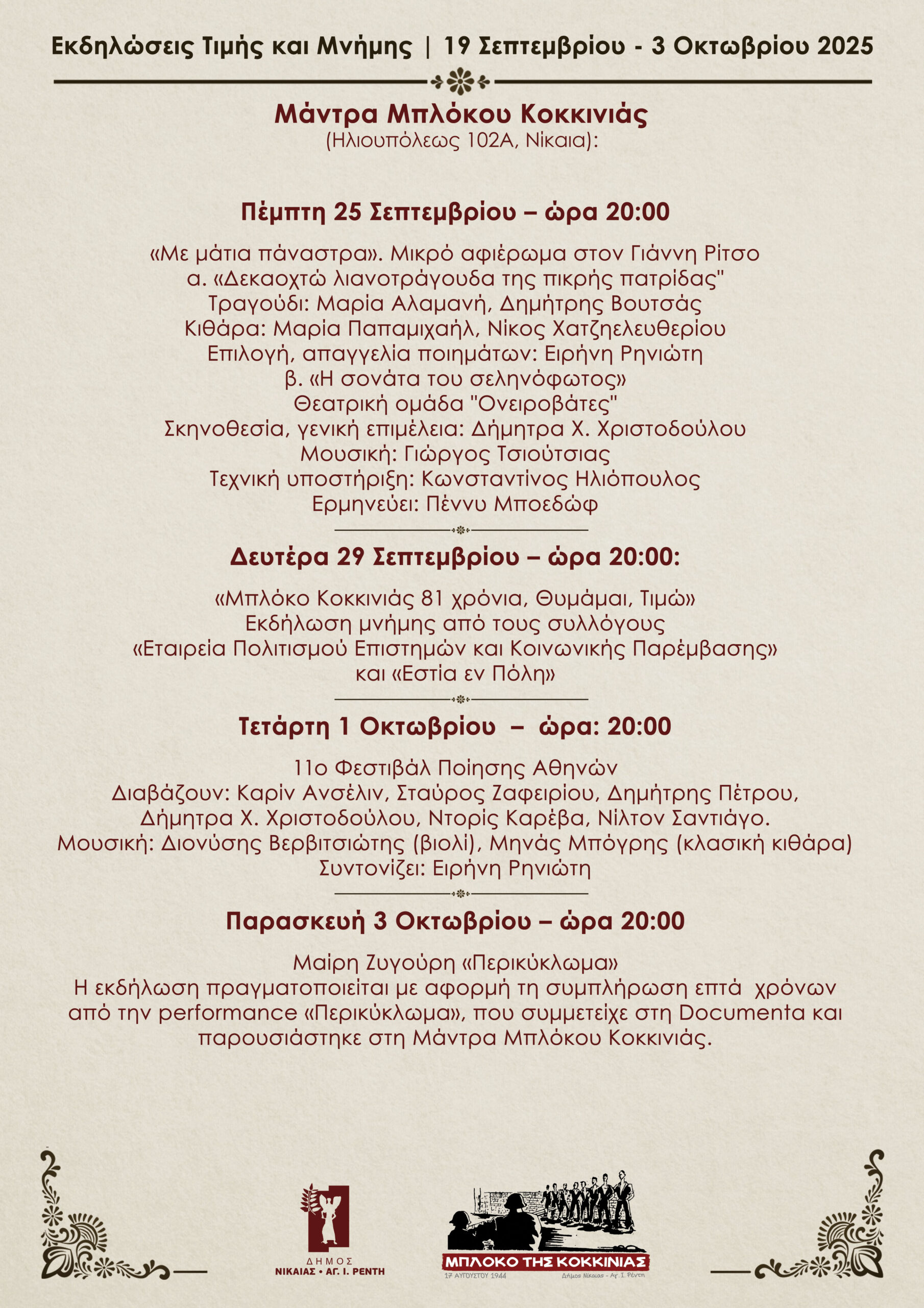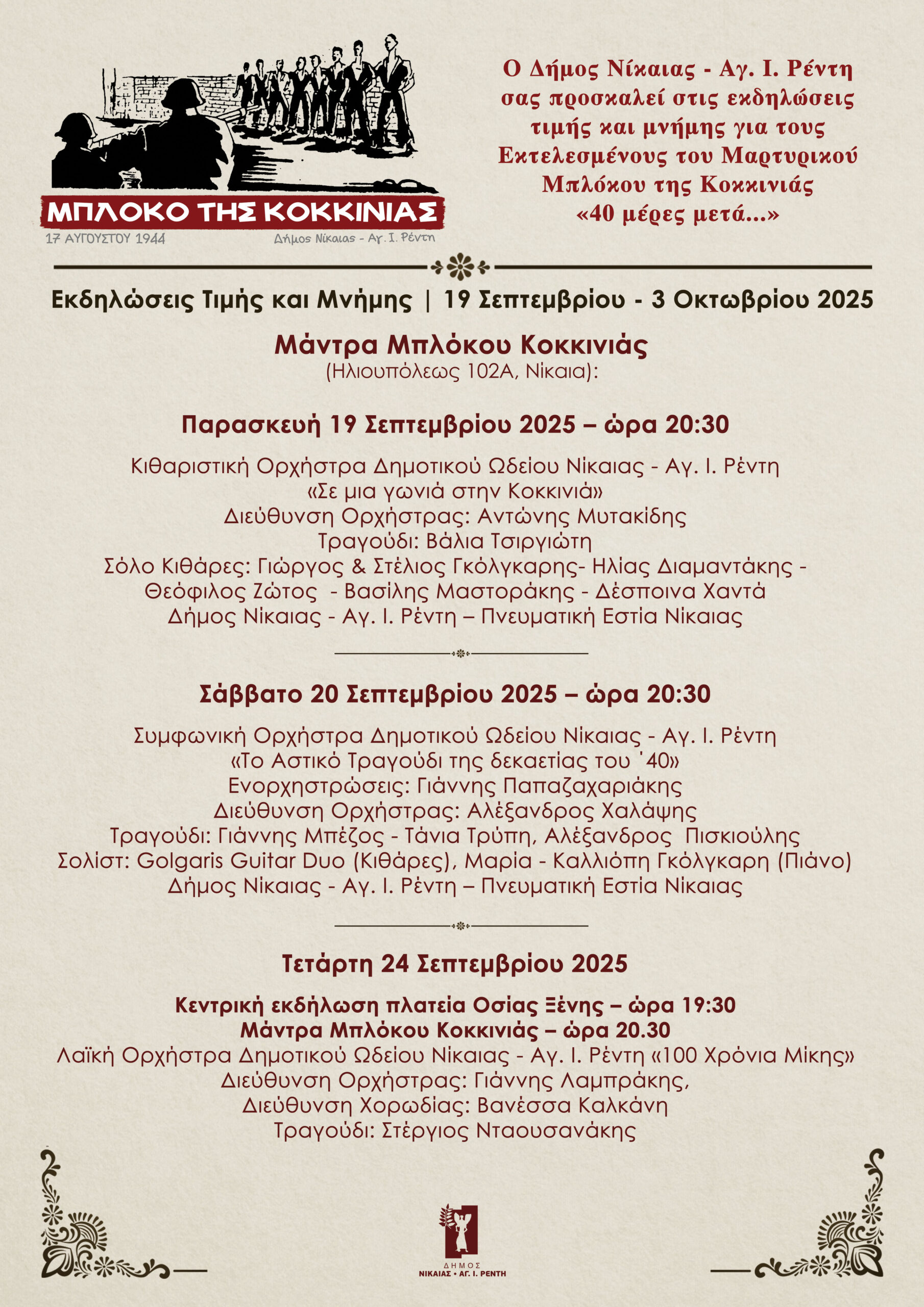 - Ο Δήμος Νίκαιας – Αγ. Ι. Ρέντη διοργανώνει εκδηλώσεις μνήμης από 19 Σεπτεμβρίου έως 3 Οκτωβρίου 2025 για τους ήρωες του Μπλόκου της Κοκκινιάς.