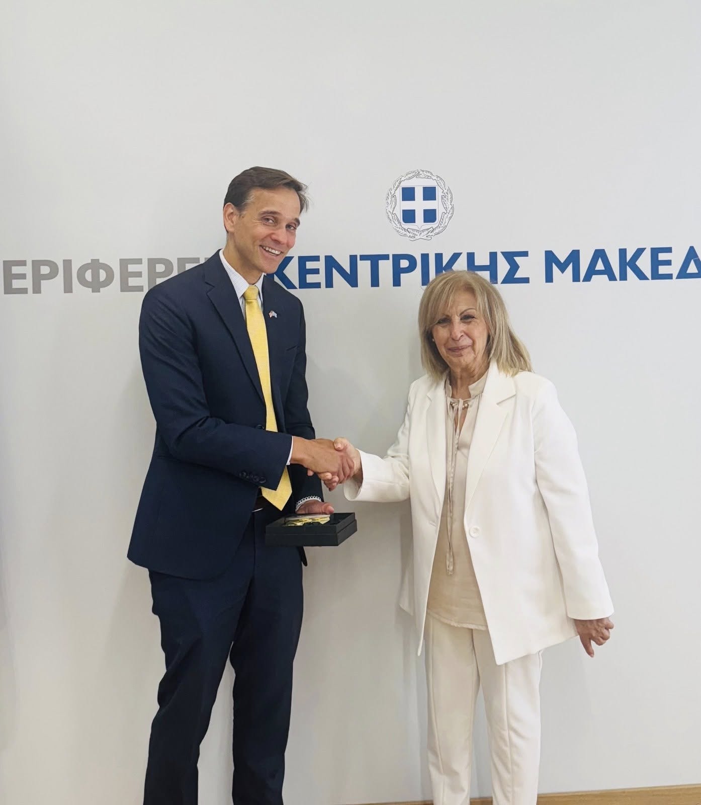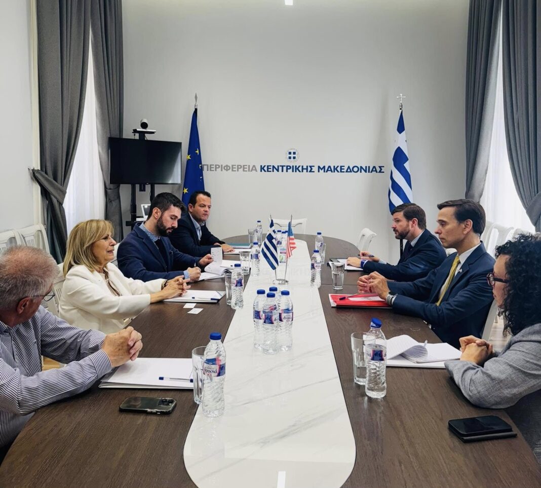 Μια εποικοδομητική συνάντηση με τον Επιτετραμμένο της Πρεσβείας των Ηνωμένων Πολιτειών Αμερικής στην Ελλάδα, κ. Joshua Huck, είχε στα γραφεία της Περιφέρειας Κεντρικής Μακεδονίας, η Περιφερειάρχης Αθηνά Αηδονά.