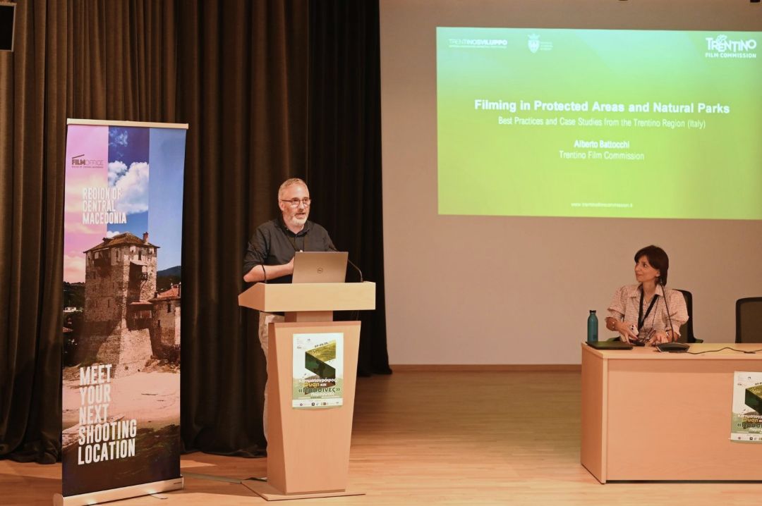 • Ο Alberto Battocchi (επικεφαλής παραγωγών στο Trentino Film Commission, Ιταλία) παρουσίασε το παράδειγμα της περιοχής του Trento στη Βόρεια Ιταλία, μιας Περιφέρειας με μεγάλο φυσικό πλούτο, που καταφέρνει να συνδυάζει επιτυχημένα την παραγωγή ταινιών με την προστασία της φύσης. Επίσης, ο κ. Battocchi ως εκπρόσωπος του ευρωπαϊκού δικτύου Green Film μίλησε για το σύστημα «πράσινης» πιστοποίησης στις οπτικοακουστικές παραγωγές, με στόχο τη μείωση του περιβαλλοντικού αποτυπώματος στη βιομηχανία του κινηματογράφου.