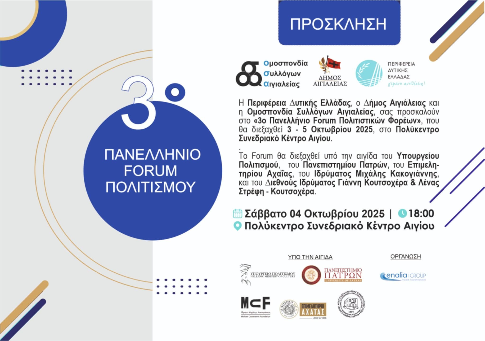 Η Περιφέρεια Δυτικής Ελλάδας, ο Δήμος Αιγιαλείας και η Ομοσπονδία Συλλόγων Αιγιαλείας, διοργανώνουν την κεντρική εκδήλωση του «3ου Πανελλήνιου Forum Πολιτιστικών Φορέων», που θα πραγματοποιηθεί το Σάββατο, 4 Οκτωβρίου 2025 και ώρα 18:30, στο Πολύκεντρο Συνεδριακό Κέντρο Αιγίου.