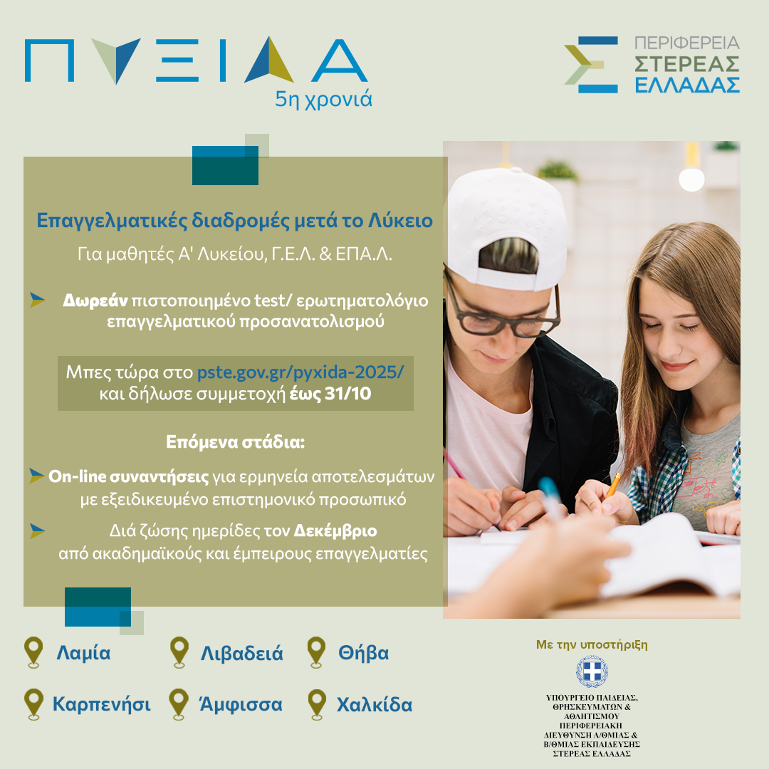 - Η Περιφέρεια Στερεάς Ελλάδας επαναφέρει το πρόγραμμα «ΠΥΞΙΔΑ» για πέμπτη συνεχόμενη χρονιά, στοχεύοντας στον επαγγελματικό προσανατολισμό μαθητών Α' τάξης Λυκείου.