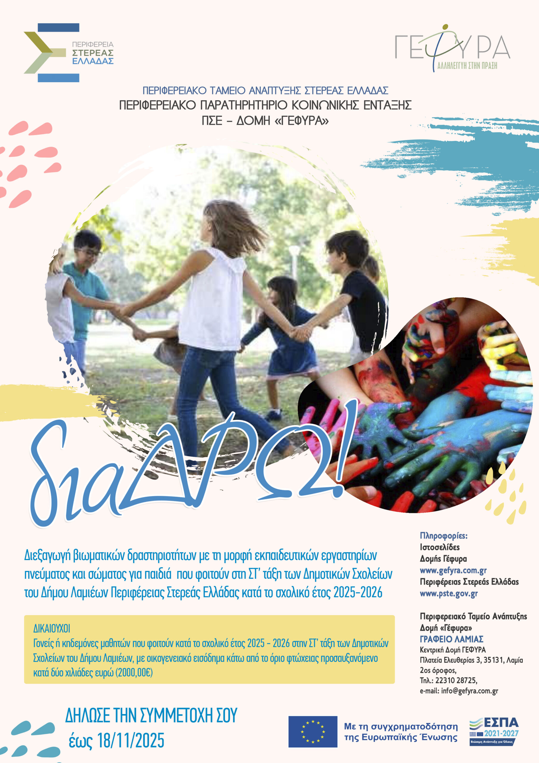 Η Περιφέρεια Στερεάς Ελλάδας, μέσω της Δομής «ΓΕΦΥΡΑ», ξεκινά πιλοτική δράση με τίτλο «διαΔΡΩ», χρηματοδοτούμενη από το Ευρωπαϊκό Κοινωνικό Ταμείο, για μαθητές της ΣΤ' τάξης των Δημοτικών Σχολείων του Δήμου Λαμιέων. Η δράση περιλαμβάνει βιωματικά εκπαιδευτικά εργαστήρια που συνδυάζουν το πνεύμα και το σώμα, ενισχύοντας τη γνωστική ανάπτυξη, την αυτοεκτίμηση, και την κριτική σκέψη των μαθητών.