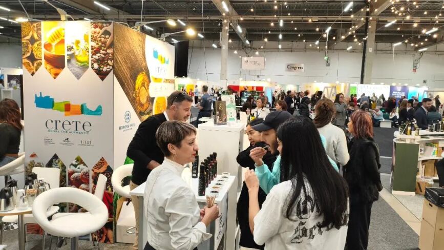 • Στο περίπτερο παρουσιάστηκαν προϊόντα υψηλής διατροφικής αξίας, όπως το ελαιόλαδο ΠΓΕ και κρητικά κρασιά, προσελκύοντας το ενδιαφέρον επαγγελματιών.