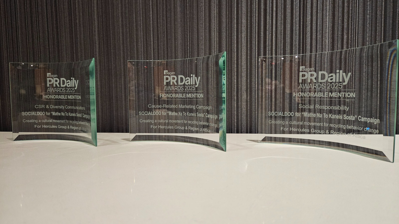 Η πρωτότυπη καμπάνια ενημέρωσης και ευαισθητοποίησης που σχεδιάστηκε και υλοποιήθηκε από την εταιρεία στρατηγικής επικοινωνίας SOCIALDOO, έλαβε χθες τριπλή τιμητική διάκριση στα PR Daily Awards της Νέας Υόρκης, έναν από τους κορυφαίους θεσμούς παγκοσμίως στον χώρο της επικοινωνίας και των δημοσίων σχέσεων.
