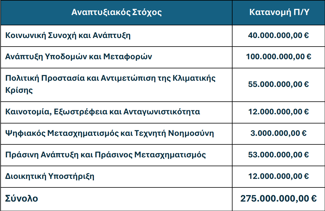 Στο πλαίσιο της συνεδρίασης, εγκρίθηκε το Περιφερειακό Πρόγραμμα Ανάπτυξης (ΠΠΑ) Περιφέρειας Στερεάς Ελλάδας προγραμματικής περιόδου 2026-2030, το οποίο έχει συνολικό προϋπολογισμό ύψους 275.000.000 ευρώ και κατανέμεται σε συγκεκριμένους αναπτυξιακούς στόχους, όπως φαίνεται στον παρακάτω πίνακα.