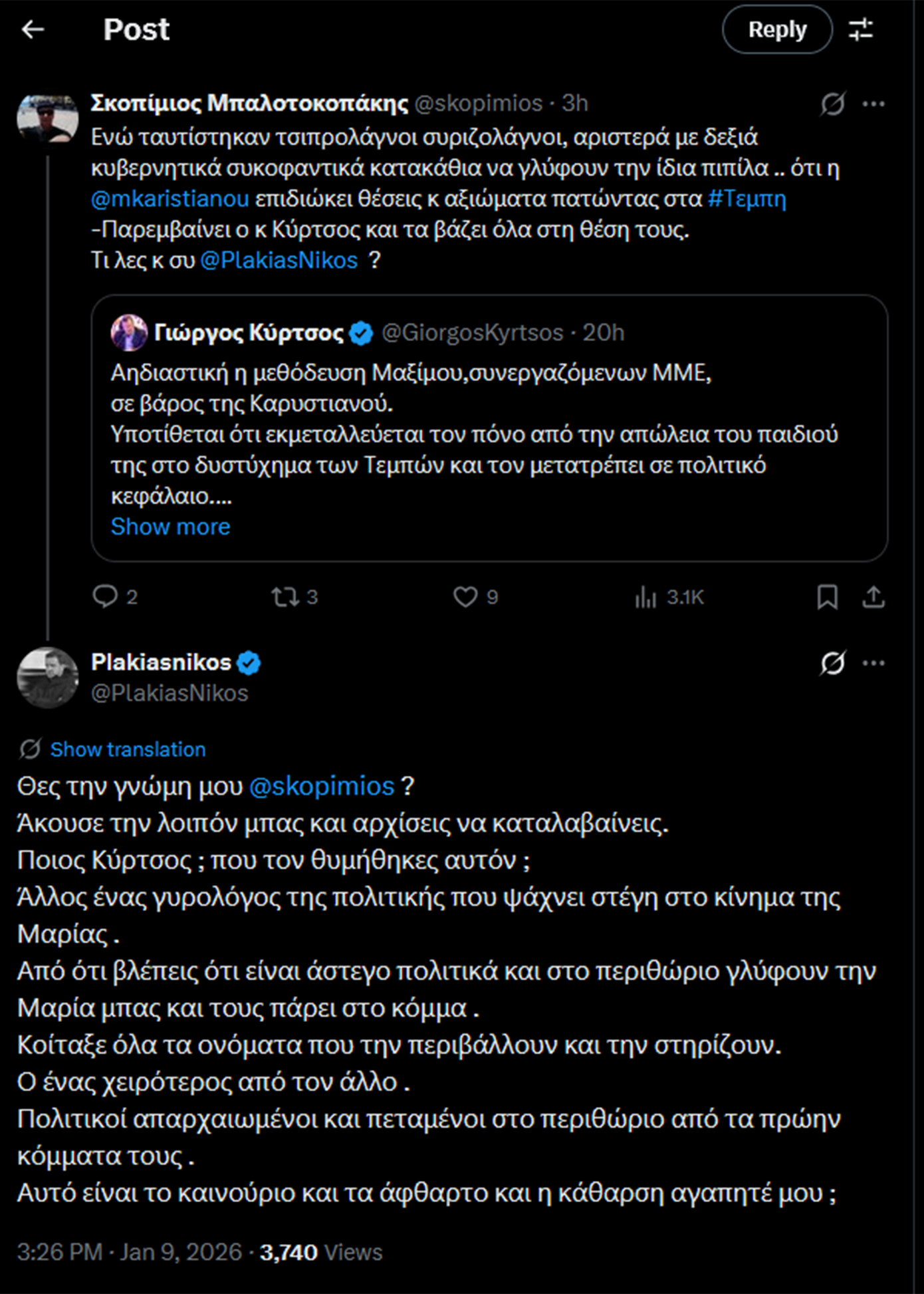 Ο Νίκος Πλακιάς σχολίασε ανάρτηση στα μέσα κοινωνικής δικτύωσης που αναφερόταν στο σενάριο δημιουργίας κόμματος από τη Μαρία Καρυστιανού.