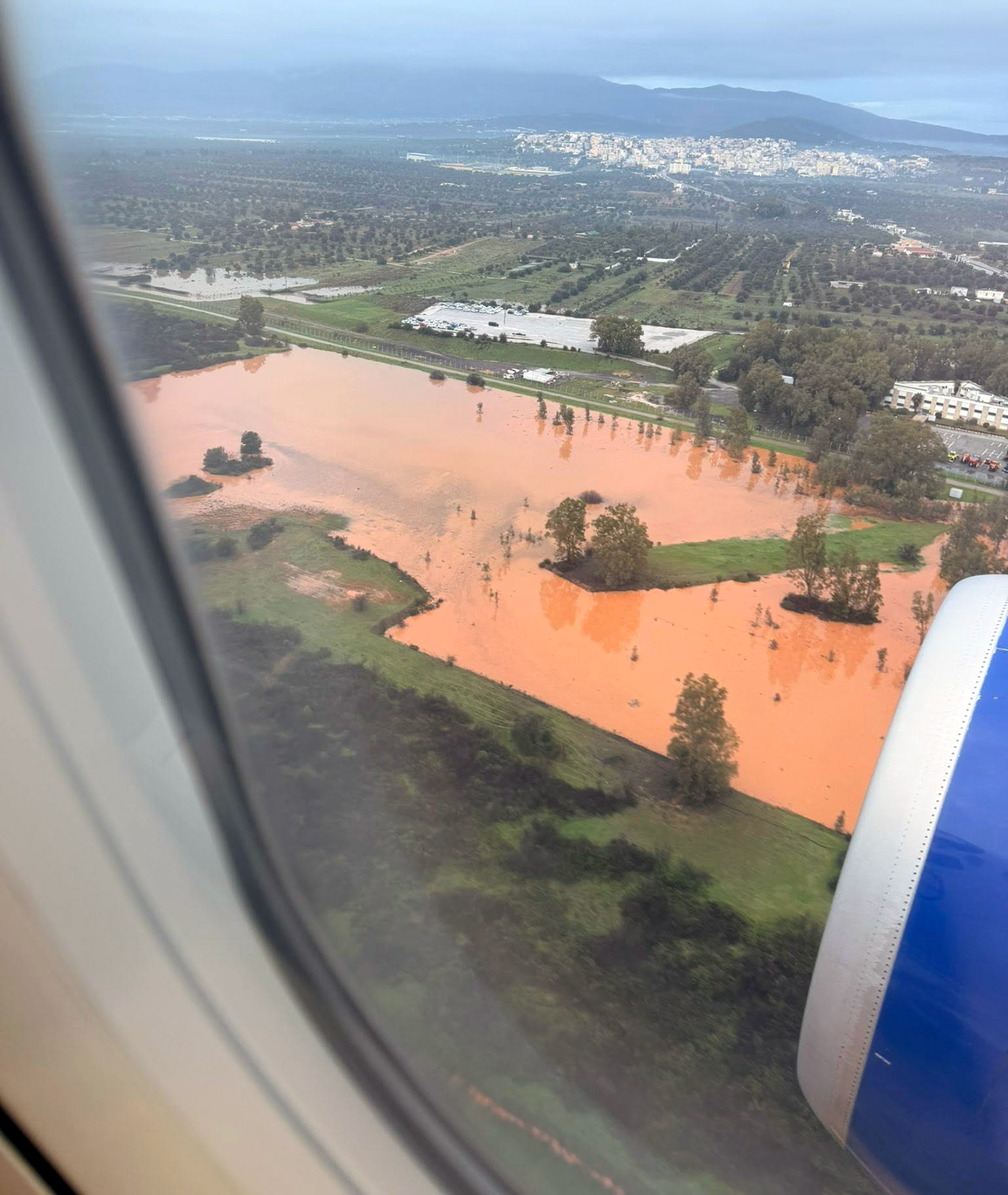 Στην Ανατολική Αττική, επιβάτες πτήσης κατέγραψαν κατά την προσγείωση στο Ελευθέριος Βενιζέλος το πρωί της Πέμπτης. εικόνες από πλημμυρισμένες εκτάσεις και φουσκωμένα ρέματα. Από ψηλά διακρίνονται εκτεταμένες πλημμυρισμένες περιοχές, καθώς και ρέματα που έχουν φουσκώσει επικίνδυνα από τις έντονες βροχοπτώσεις των τελευταίων ωρών.