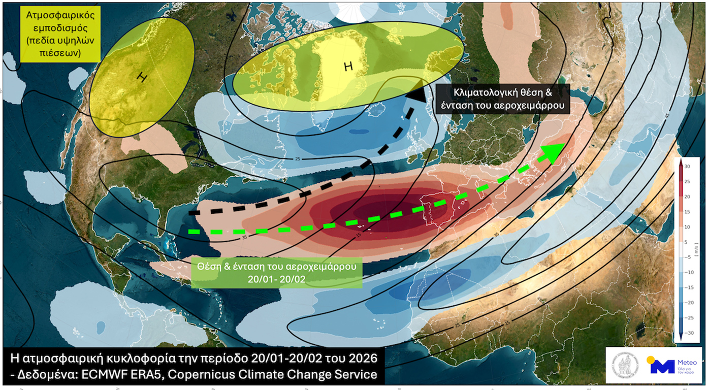Όπως διακρίνεται και στην Εικόνα 1, η κλιματολογική μέση (αναμενόμενη) θέση του αεροχειμάρρου εκτείνεται από τις ανατολικές ακτές της Β. Αμερικής προς τον Βορειοανατολικό Ατλαντικό και τη Σκανδιναβία. Ωστόσο, το χρονικό διάστημα από τις 20 Ιανουαρίου έως τις 20 Φεβρουαρίου του 2026 ο αεροχείμαρρος ήταν εξασθενημένος στα βορειότερα τμήματα του Β. Ατλαντικού (μπλε αποχρώσεις στην Εικόνα 1) και πιο ισχυρός στα νότια τμήματα αυτού (κόκκινες αποχρώσεις στην Εικόνα 1), ενώ εκτεινόταν έως και την Ανατολική Μεσόγειο.
