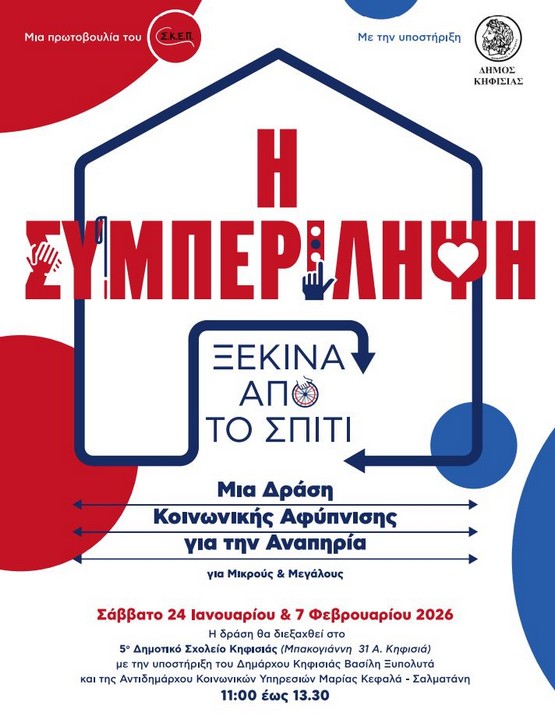 Μετά την επιτυχημένη πρώτη δράση “Η Συμπερίληψη ξεκινά από το Σπίτι», στο πλαίσιο του πιλοτικού 1ου Εκπαιδευτικού Προγράμματος Κοινωνικής Αφύπνισης που υλοποιεί ο Σύνδεσμος Κοινωνικής Ευθύνης για Παιδιά και Νέους (Σ.Κ.Ε.Π.) σε συνεργασία με τον Δήμο Κηφισιάς, προσκαλεί το Σάββατο 7 Φεβρουαρίου, στη βιωματική δράση, που θα φιλοξενηθεί ξανά στο 5ο Δημοτικό Σχολείο Κηφισιάς (Μπακογιάννη 31Α – Κηφισιά) στις 11.00. π.μ.