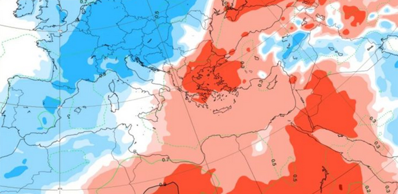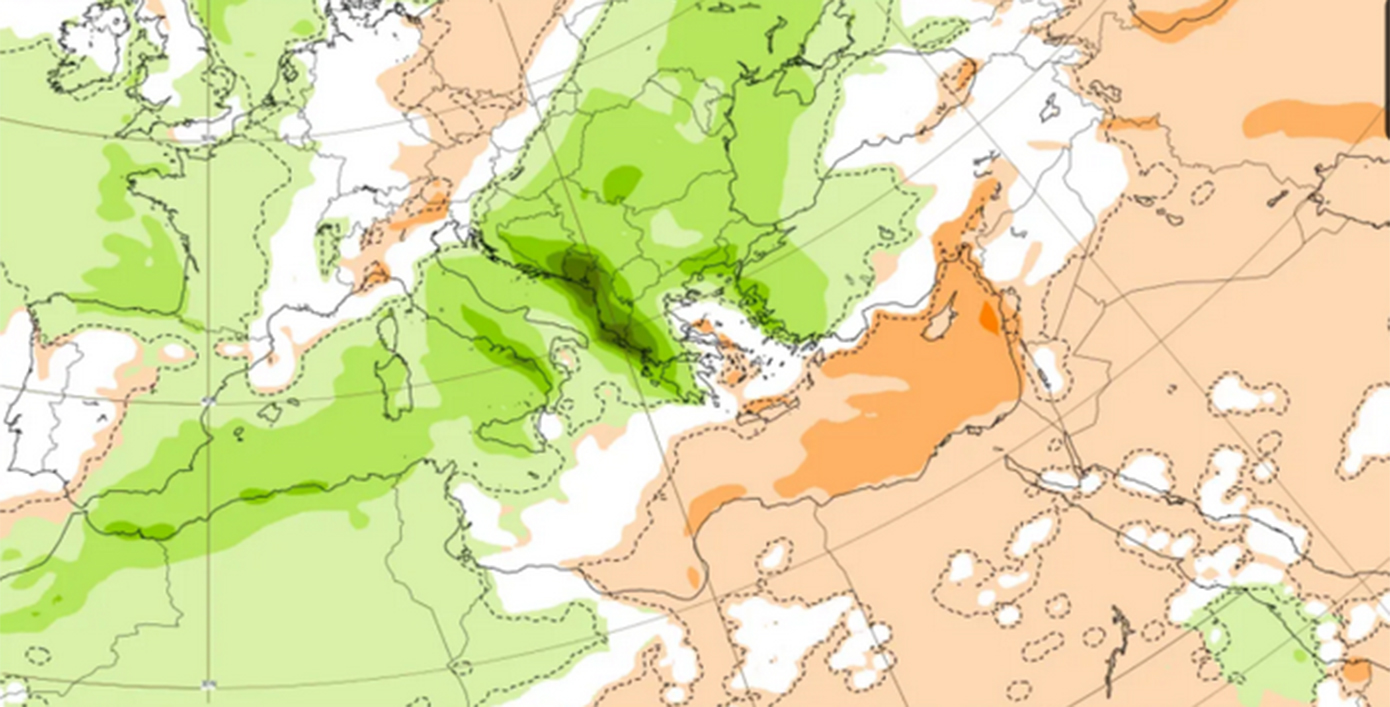 Παράλληλα, τα υετικά σήματα εξασθενούν. Οι κύριες βροχοφόρες ζώνες μετατοπίζονται βορειότερα, προς την Κεντρική Ευρώπη και τα Βαλκάνια, αφήνοντας την Ελλάδα με πιο στεγνό καιρό, διακοπτόμενο μόνο από ασθενείς και σύντομες διαταραχές. Τα διαστήματα ξηρού καιρού φαίνεται να είναι περισσότερα σε σχέση με την προηγούμενη εβδομάδα.
