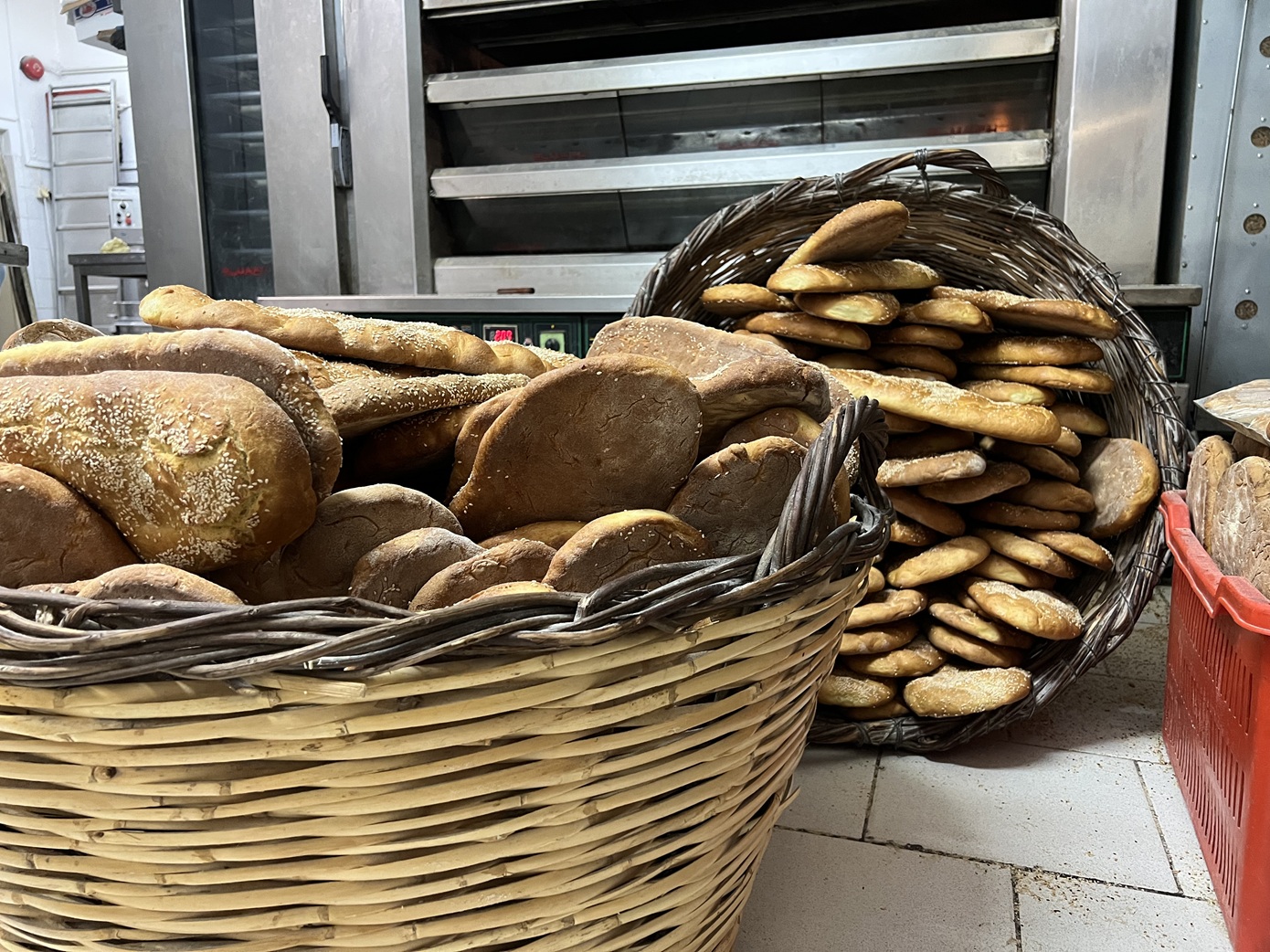 Μια γλυκιά θαλπωρή, γέλια και πειράματα και με ένα μεγάλο μέρος της παραγωγής να περιμένει ήδη μέσα στο μεγάλα κοφίνια για να τοποθετηθεί στην συνέχεια στα ράφια που είχαν διακοσμηθεί με αποκριάτικες μάσκες και γιρλάντες. «Αυτή τη δουλειά την έχουν αναλάβει οι γυναίκες» μου είπε ο φούρναρης Ντίνος Αποκορίτης και αφού με κέρασε ζεστό καφέ, με πέρασε στο εργαστήριο για να δω την προετοιμασία και το ψήσιμο και στην συνέχεια καθίσαμε σε μια μεριά για να μιλήσουμε για τι άλλο; Μα για λαγάνες!