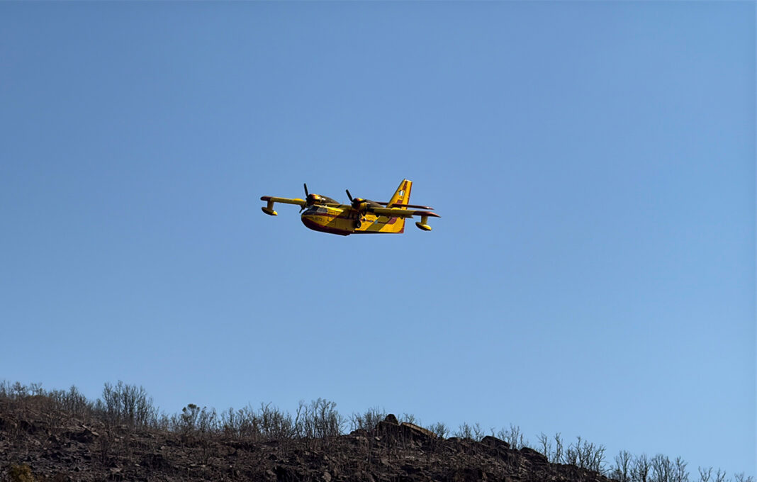 Στην επιχείρηση συνδράμει και ένα αεροσκάφος, πραγματοποιώντας ρίψεις νερού από αέρος.