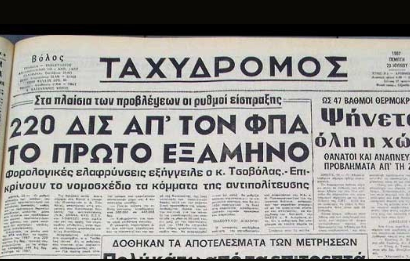 1987: Τίθεται σε ισχύ στην Ελλάδα ο Φόρος Προστιθέμενης Αξίας (ΦΠΑ), στο πλαίσιο της προσαρμογής της χώρας στα ευρωπαϊκά φορολογικά πρότυπα και της αντικατάστασης παλαιότερων έμμεσων φόρων. Η επιβολή του συνοδεύεται από αισθητή αύξηση των τιμών σε βασικά αγαθά και υπηρεσίες, τροφοδοτεί τον πληθωρισμό και προκαλεί έντονες αντιδράσεις από καταναλωτές και επαγγελματίες, που βλέπουν το κόστος ζωής να ανεβαίνει απότομα.