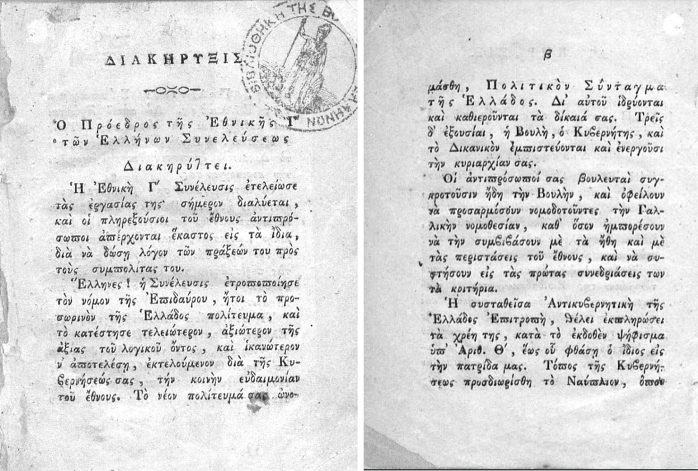 1827: Η Γ΄ Εθνοσυνέλευση στην Τροιζήνα ψηφίζει το Πολιτικόν Σύνταγμα της Ελλάδος. Το Σύνταγμα θεωρείται από τα πιο φιλελεύθερα της εποχής του και όρισε τον Ιωάννη Καποδίστρια ως Κυβερνήτη της Ελλάδας, σε μια κρίσιμη φάση της Επανάστασης.