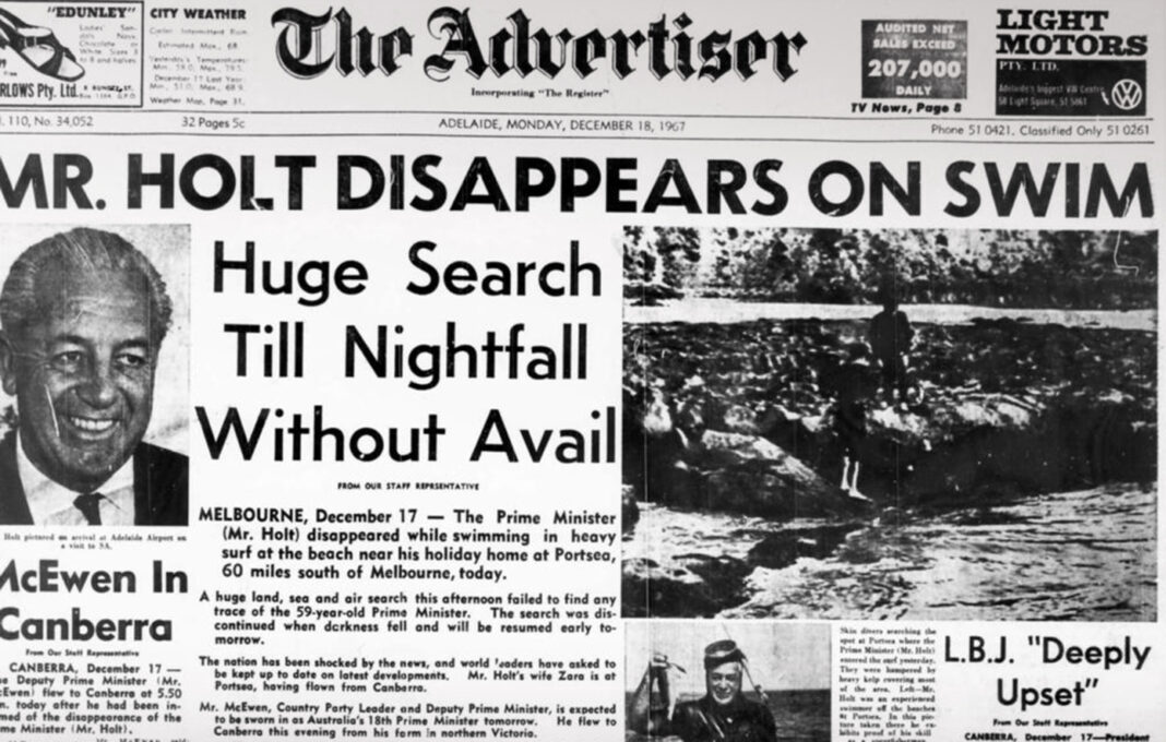 Στις 17 Δεκεμβρίου 1967, ο πρωθυπουργός της Αυστραλίας, Χάρολντ Χολτ, εξαφανίστηκε μυστηριωδώς ενώ κολυμπούσε σε επικίνδυνα νερά της παραλίας Cheviot, κοντά στη Μελβούρνη. Η εξαφάνισή του προκάλεσε σοκ στη χώρα, η οποία βρέθηκε ξαφνικά χωρίς ηγέτη.