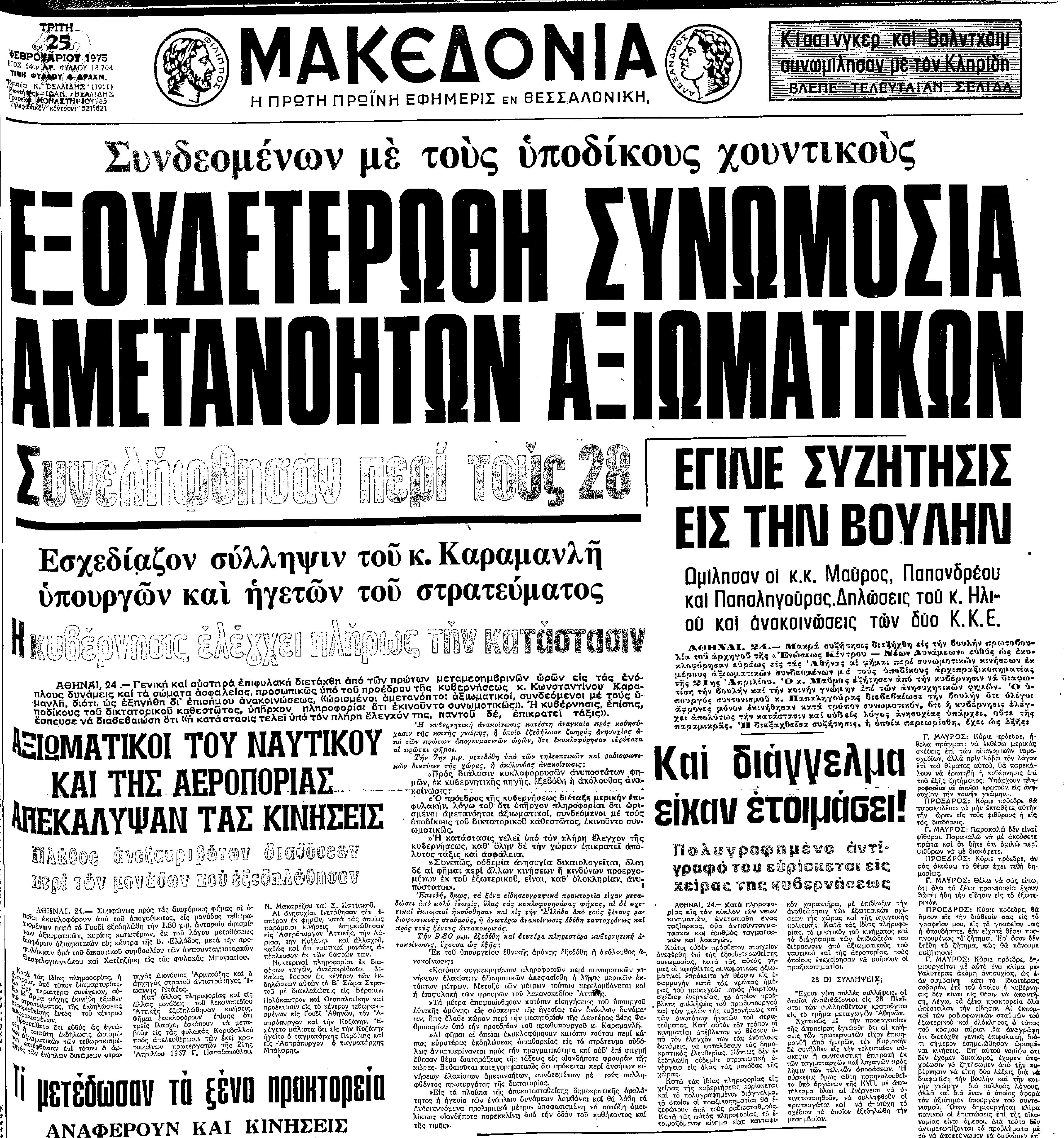 1975: Ο υπουργός Εθνικής Άμυνας, Ευάγγελος Αβέρωφ, ανακοινώνει την καταστολή συνωμοτικής κίνησης στο στράτευμα, γνωστής ως «Πραξικόπημα της Πιτζάμας», η οποία αποκαλύπτεται στις 24 Φεβρουαρίου πριν τεθεί σε εφαρμογή το σχέδιο των κινηματιών. Τη συνωμοσία οργανώνει ομάδα αξιωματικών πιστών στον έγκλειστο τέως δικτάτορα Δημήτριο Ιωαννίδη, με στόχο την ανατροπή ή τον εκβιασμό της μεταπολιτευτικής κυβέρνησης του Κωνσταντίνου Καραμανλή, ώστε να παύσουν οι διώξεις των πρωταιτίων της δικτατορίας και να περιοριστεί η δράση της Αριστεράς. Η αποκάλυψη της κίνησης –από δίκτυο νομιμοφρόνων αξιωματικών που είχε αναπτύξει ο Αβέρωφ– οδηγεί στη σύλληψη 37 αξιωματικών με την κατηγορία της «ενώσεως προς στάσιν» και στην αποστρατεία δεκάδων ακόμη, επιβεβαιώνοντας ότι τα «σταγονίδια» της Χούντας παρέμεναν ενεργός κίνδυνος μέσα στις Ένοπλες Δυνάμεις. Η ονομασία «Πραξικόπημα της Πιτζάμας» αποδίδεται στον ίδιο τον Αβέρωφ και συνδέεται με το γεγονός ότι αρκετοί από τους συνωμότες συνελήφθησαν νύχτα, στα σπίτια τους, φορώντας τις πιτζάμες τους.