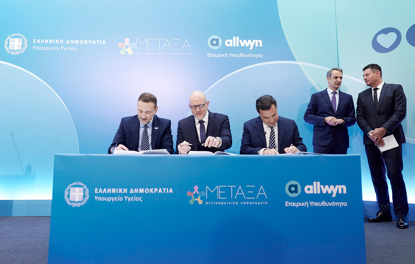 Υπογραφή μνημονίου συνεργασίας από τους Σαράντο Ευσταθόπουλο, Διοικητή του Αντικαρκινικού Νοσοκομείου «Μεταξά», Jan Karas, Πρόεδρο και Διευθύνοντα Σύμβουλο της Allwyn στην Ελλάδα και Άδωνι Γεωργιάδη, Υπουργό Υγείας, παρουσία του Πρωθυπουργού, Κυριάκου Μητσοτάκη και του Ιδρυτή και Προέδρου της Allwyn, Karel Komarek