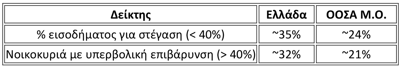 Ο δεύτερος δείκτης – τα νοικοκυριά που δαπανούν άνω του 40% του εισοδήματός τους για στέγαση, αποτυπώνει την στεγαστική υπερεπιβάρυνση (housing cost overburden). Στην Ελλάδα το ποσοστό αυτό φτάνει το ~32%, έναντι ~21% στον μέσο όρο ΟΟΣΑ. Πρόκειται για ένα επίπεδο που συνδέεται διεθνώς με αυξημένο κίνδυνο φτώχειας, περιορισμό κατανάλωσης βασικών αγαθών και αδυναμία αποταμίευσης.