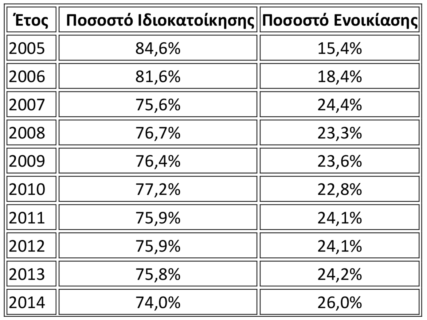 Από το 2005 έως σήμερα, η ιδιοκατοίκηση έχει μειωθεί πάνω από 17 ποσοστιαίες μονάδες.