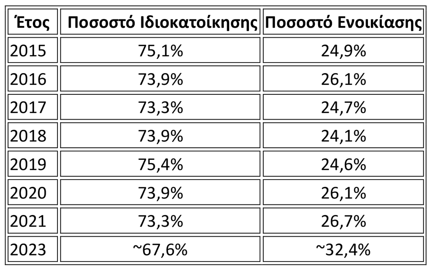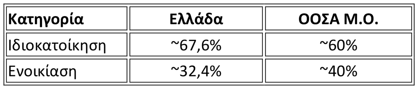 Η Ελλάδα διαχρονικά συγκαταλέγεται στις ευρωπαϊκές χώρες με υψηλό ποσοστό ιδιοκατοίκησης, στοιχείο που λειτουργούσε ως άτυπος μηχανισμός κοινωνικής προστασίας. Ωστόσο, τα πρόσφατα δεδομένα καταδεικνύουν ότι το παραδοσιακό αυτό μοντέλο μεταβάλλεται με ταχύ ρυθμό.