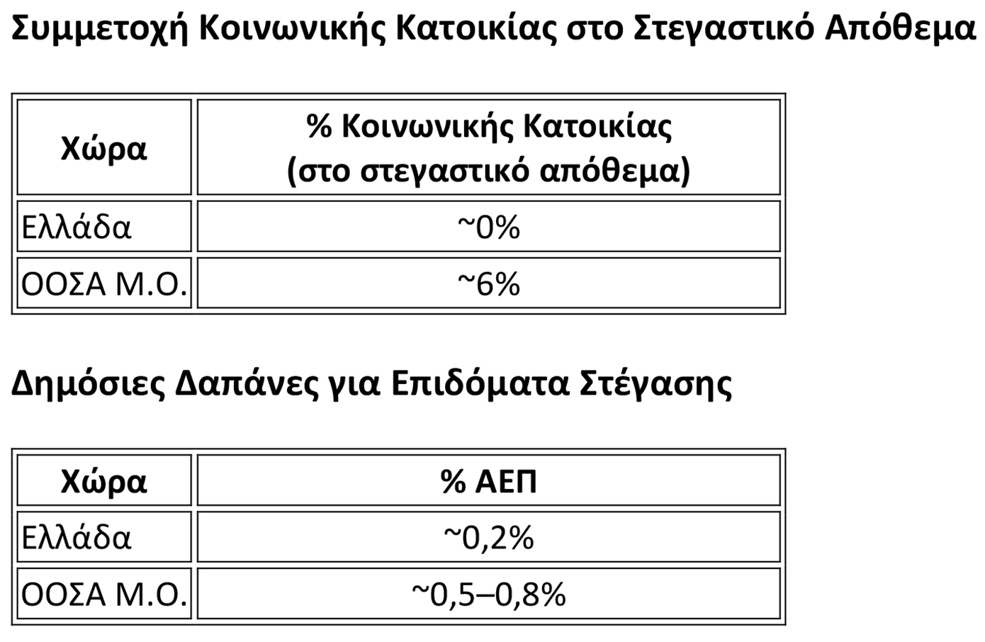 Οι παραπάνω δείκτες αποκαλύπτουν μια βασική διαρθρωτική αδυναμία: η Ελλάδα δεν διαθέτει ουσιαστικά οργανωμένο τομέα κοινωνικής – προσιτού κόστους κατοικίας. Σε πολλές χώρες του ΟΟΣΑ, η κοινωνική στέγαση λειτουργεί ως σταθεροποιητικός μηχανισμός της αγοράς, παρέχοντας προσιτές κατοικίες σε νοικοκυριά που δεν μπορούν να ανταπεξέλθουν στις τιμές της ελεύθερης αγοράς.