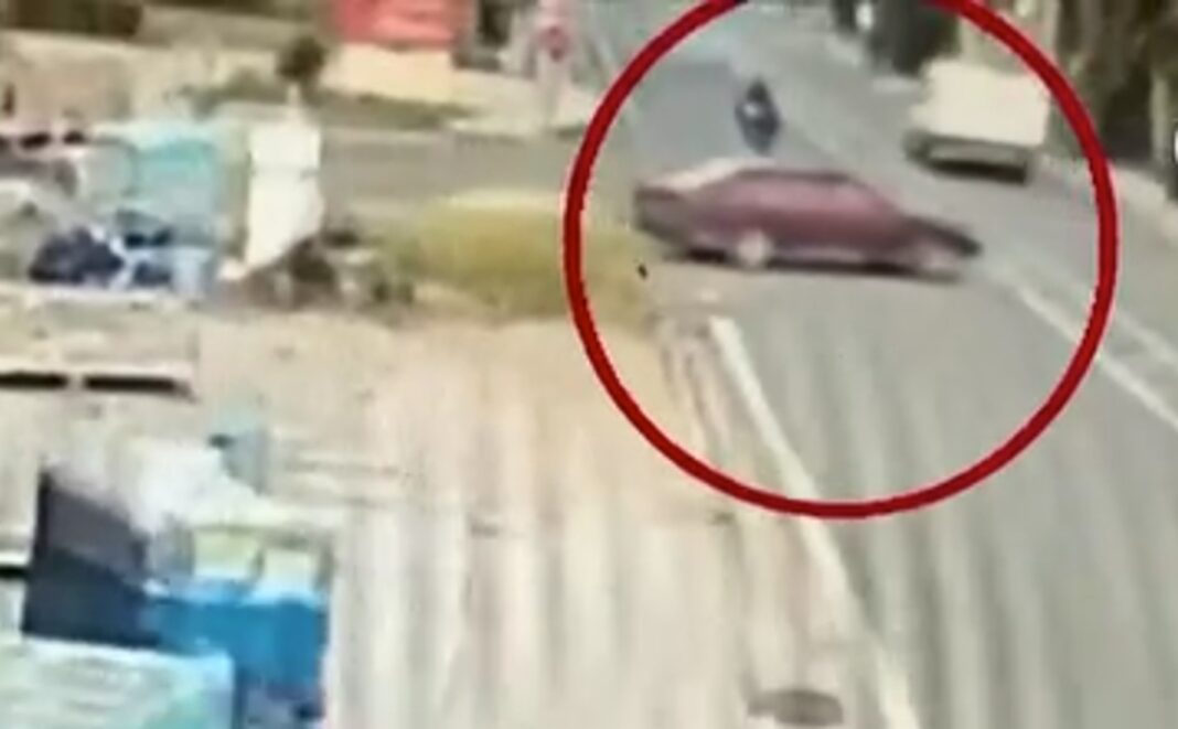 Στο οπτικό υλικό φαίνεται ξεκάθαρα ότι ο οδηγός του αυτοκινήτου βγαίνει κάθετα στον δρόμο, με αποτέλεσμα μία μηχανή που κατευθυνόταν στη λεωφόρο να πέσει πάνω του και ο μοτοσικλετιστής να εκσφενδονίζεται.