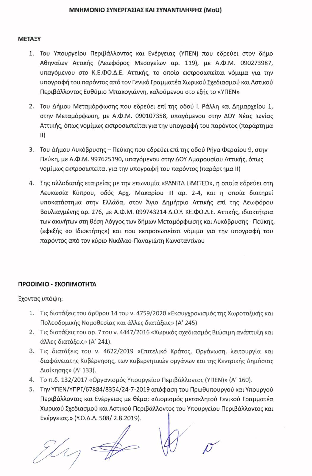 Το Μνημόνιο συνυπέγραψαν ο Γενικός Γραμματέας Χωρικού Σχεδιασμού και Αστικού Περιβάλλοντος του ΥΠΕΝ, κ. Ευθύμιος Μπακογιάννης και ο Δήμαρχος Μεταμόρφωσης κ. Στράτος Σαραούδας.