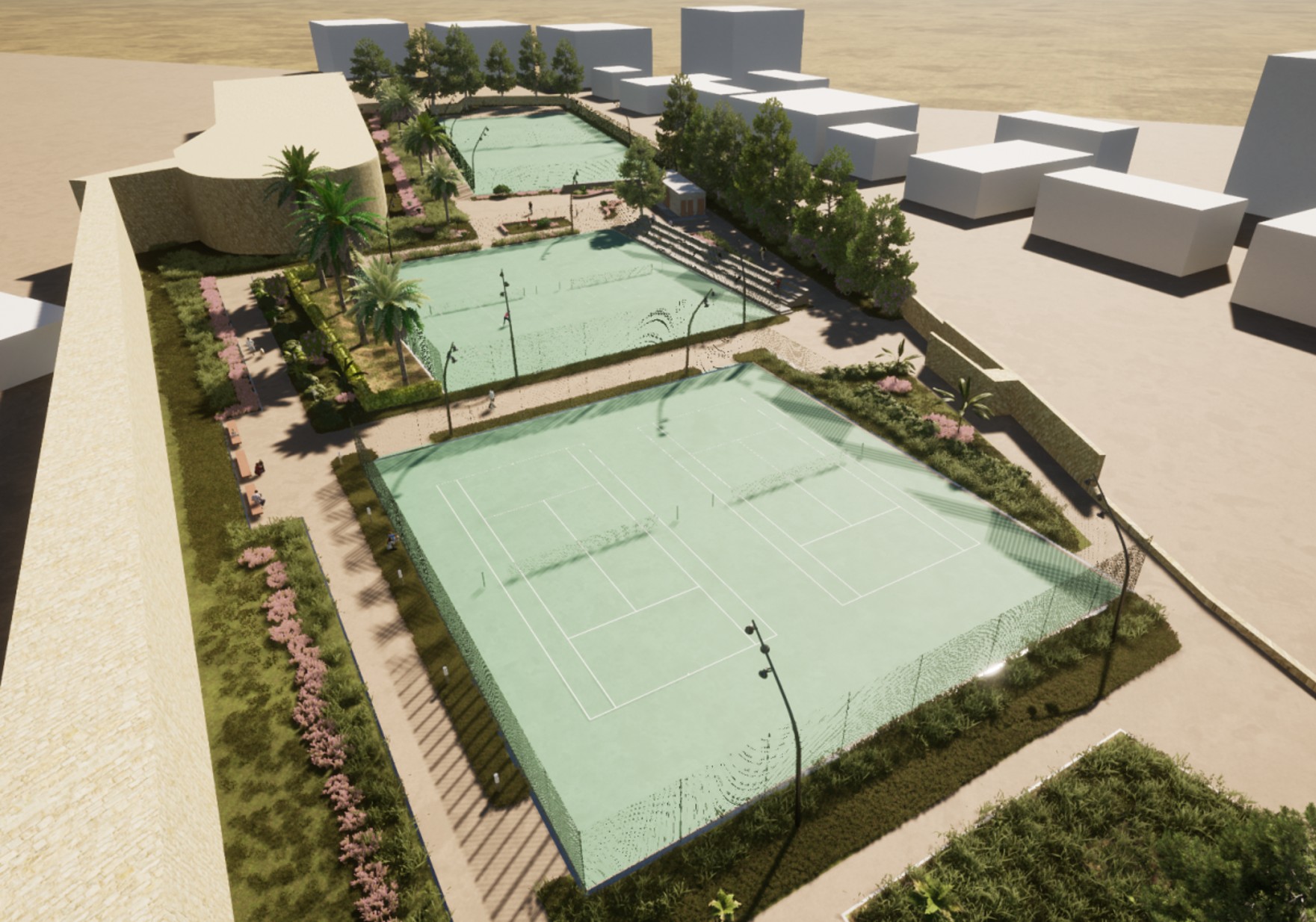 Σχετικά με την έργο της μετακίνησης των τεσσάρων γηπέδων τένις που βρίσκονται σε επαφή με το Τείχος και την προβλεπόμενη κατασκευή λυόμενου οικίσκου αποδυτηρίων, ο Αλέξης Καλοκαιρινός διευκρίνισε: «Τα γήπεδα τένις πηγαίνουν λίγο πιο ανατολικά από τη θέση που βρίσκονται, δηλαδή έχουμε μια μετατόπιση, μια απομάκρυνση από το «πόδι» του Τείχους όπως και πρέπει να γίνεται. Να μείνει μια ελεύθερη ζώνη η οποία έχει και την έννοια της προστασίας του Τείχους, χωρίς να αλλοιώνονται τα λειτουργικά χαρακτηριστικά της χρήσης των γηπέδων, η οποία θα είναι αυτή που ήταν και μάλιστα με καλύτερους όρους. Παράλληλα, υπάρχουν δύο εξειδικευμένα στερεωτικά έργα τα οποία βρίσκονται σε εξέλιξη εκεί, με την ευθύνη της Διεύθυνσης Αναστήλωσης Βυζαντινών και Μεταβυζαντινών Μνημείων του Υπουργείου Πολιτισμού, όπως ακριβώς έχει προβλεφθεί από τις μεταξύ μας συμβάσεις. Είναι σημαντικό να συγχρονιστούν τα έργα αυτά έτσι ώστε και το έργο της στερέωσης και το έργο της διαμόρφωσης της τάφρου να γίνουν με τον κατάλληλο τρόπο».