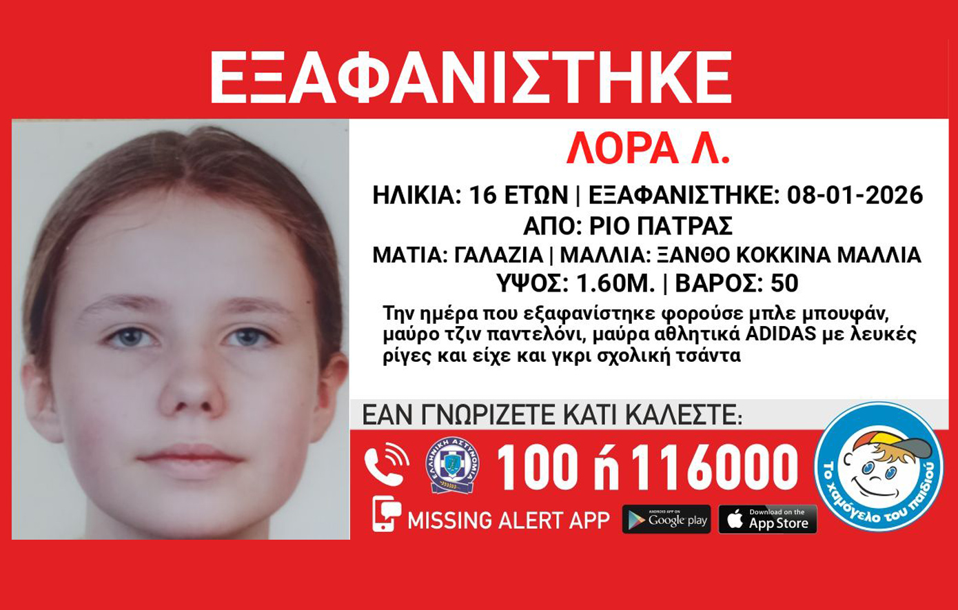 Συναγερμός έχει σημάνει στις Αρχές για την εξαφάνιση της 16χρονης Λόρας Λ, από το Ρίο της Πάτρας. Συγκεκριμένα εξαφανίστηκε στις 8 Ιανουαρίου στην περιοχή του Ρίου στην Πάτρα η Λόρα Λ., 16 ετών, γερμανικής καταγωγής.